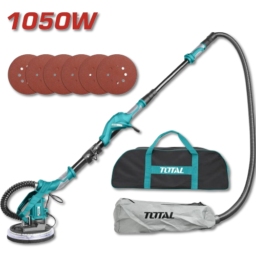 Esta es una lijadora eléctrica telescópica de la marca TOTAL, diseñada para el lijado eficiente y rápido de paneles de yeso (gypsum), masilla y techos. Opera con un motor de 1050W y cuenta con velocidad variable (600-2600 rpm) para adaptarse a diferentes acabados. Incluye una luz de trabajo integrada y un sistema de extracción de polvo para un trabajo más limpio y preciso.