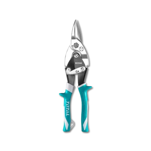 Tijera de aviación larga recta TOTAL de 250 mm (10"), diseñada para cortes precisos y rectos en láminas metálicas,plásticos duros y otros materiales de construcción.